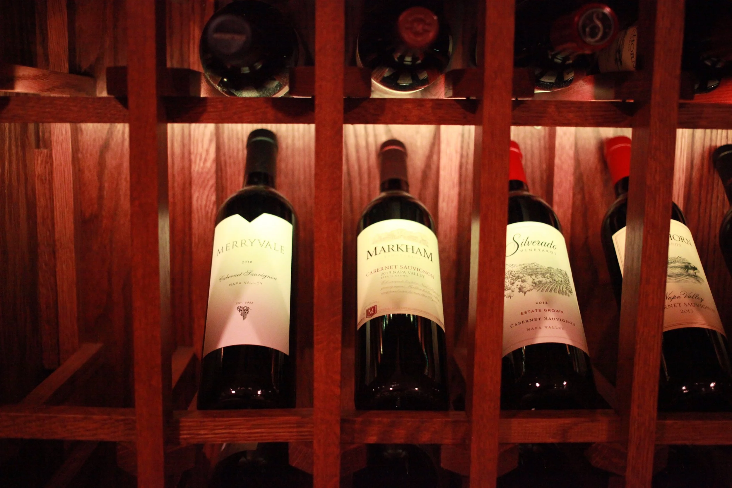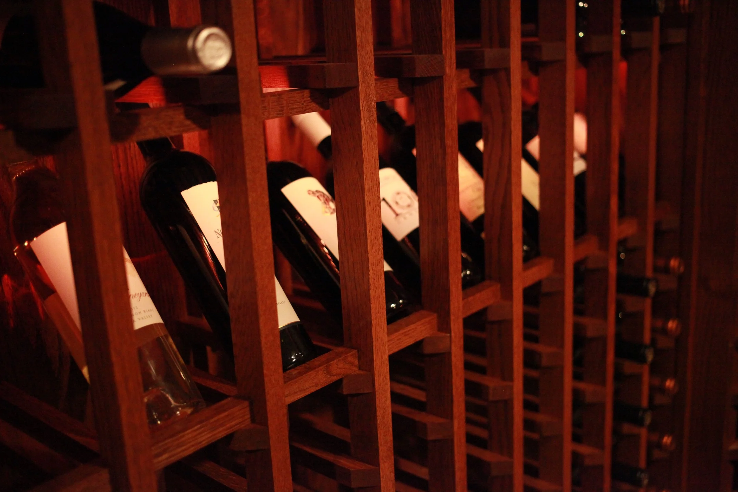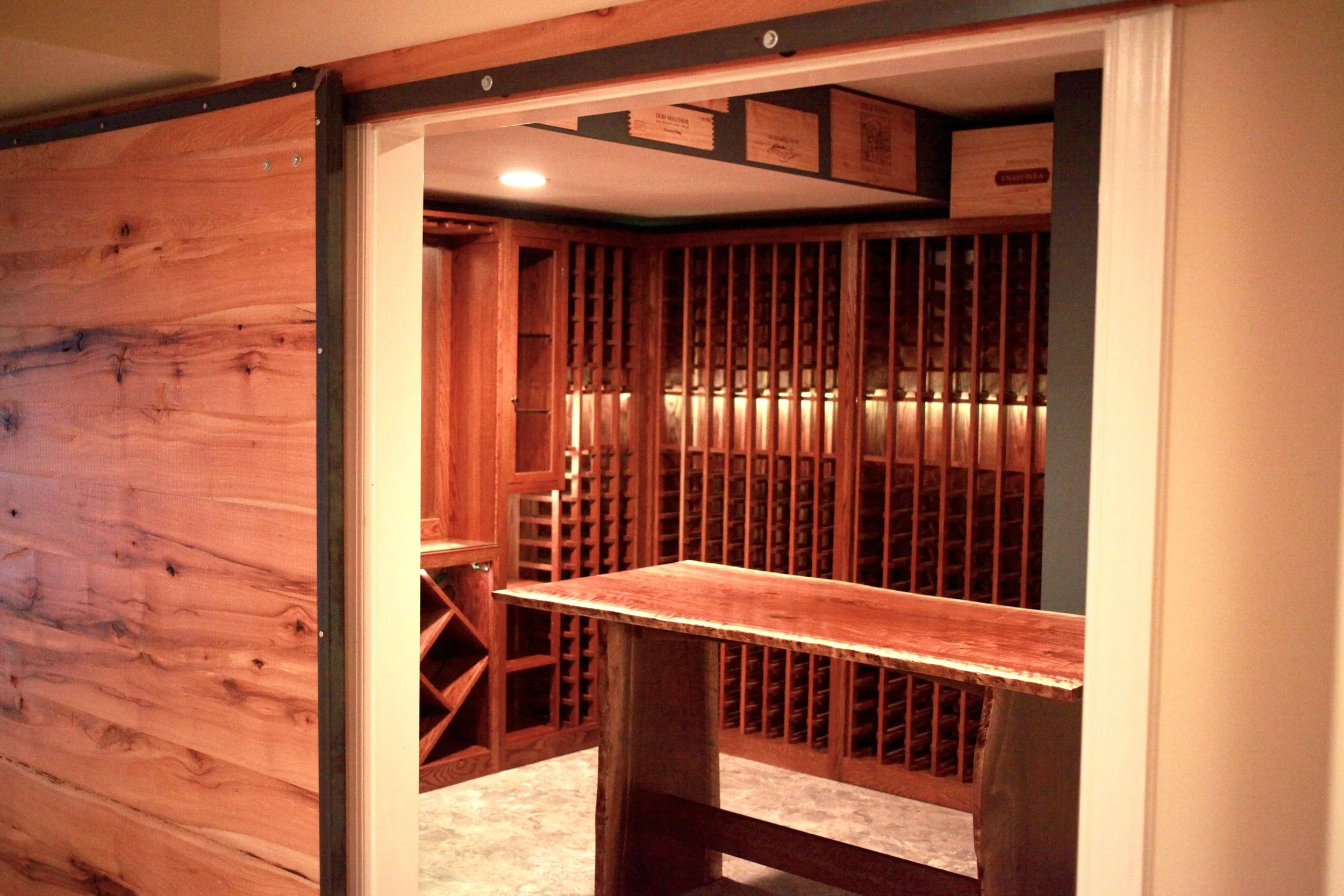 The project consisted of an oak cabinet style wine rack, a walnut book match walnut table, a reclaimed wooden wall and a barn sliding door.