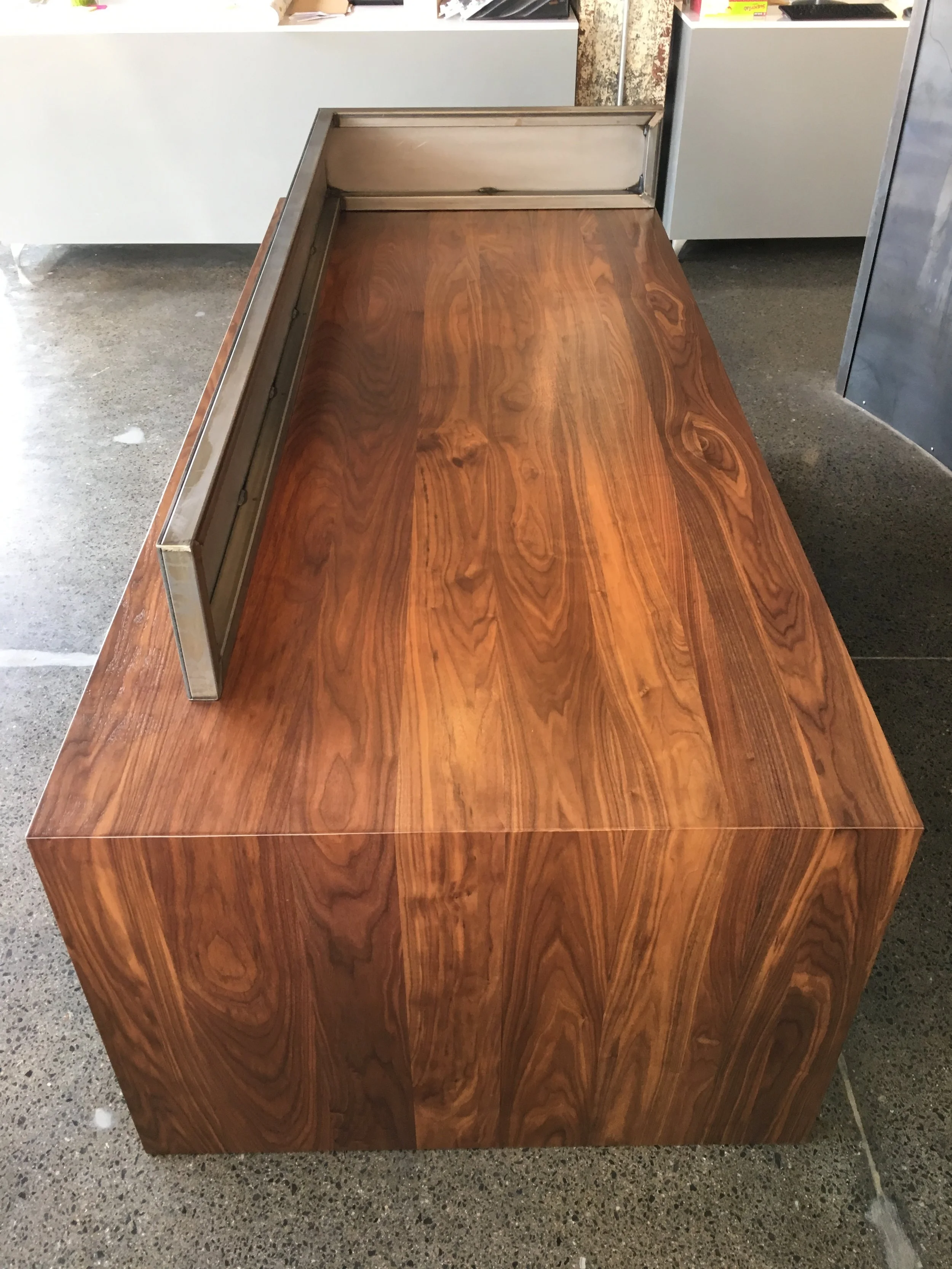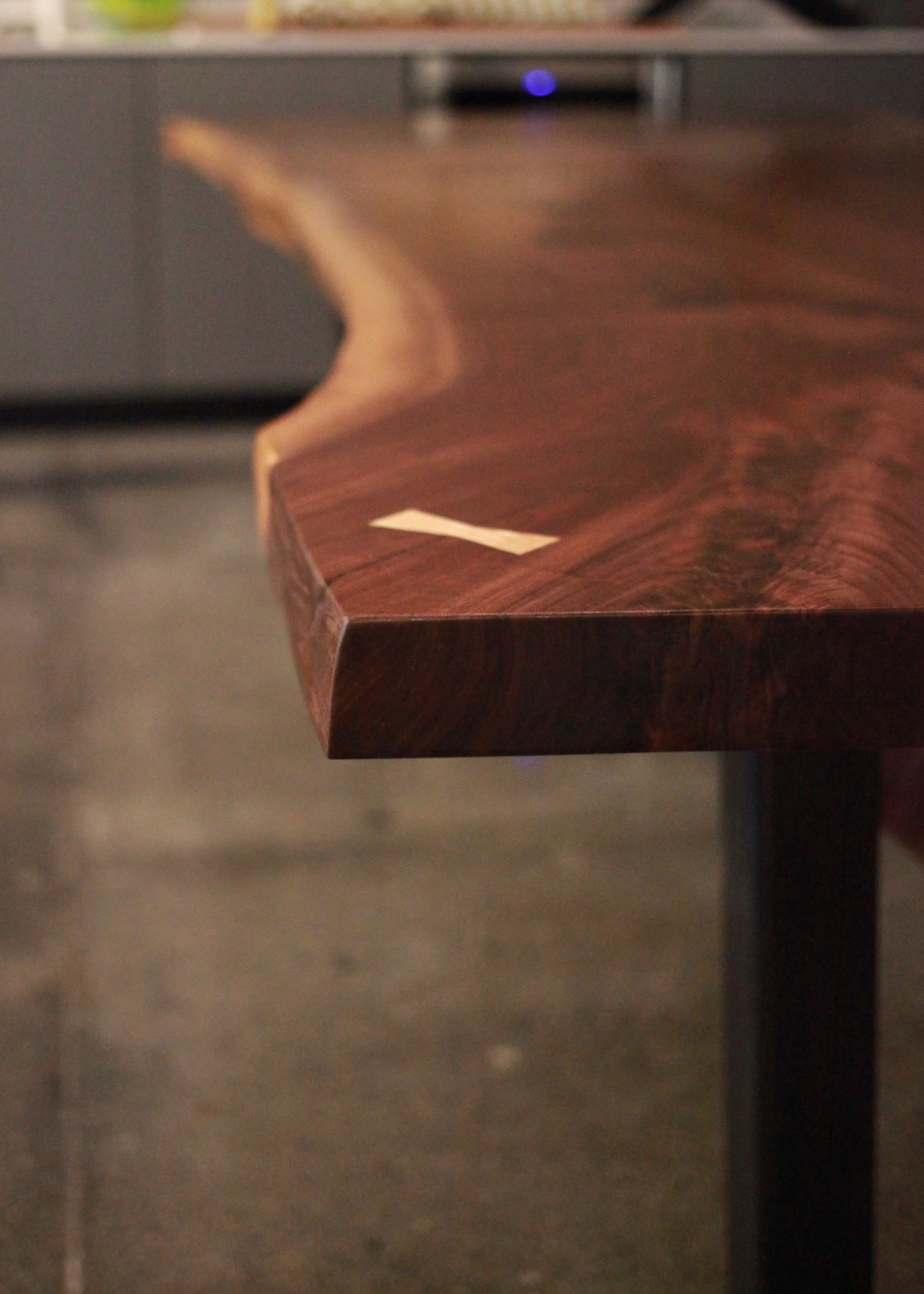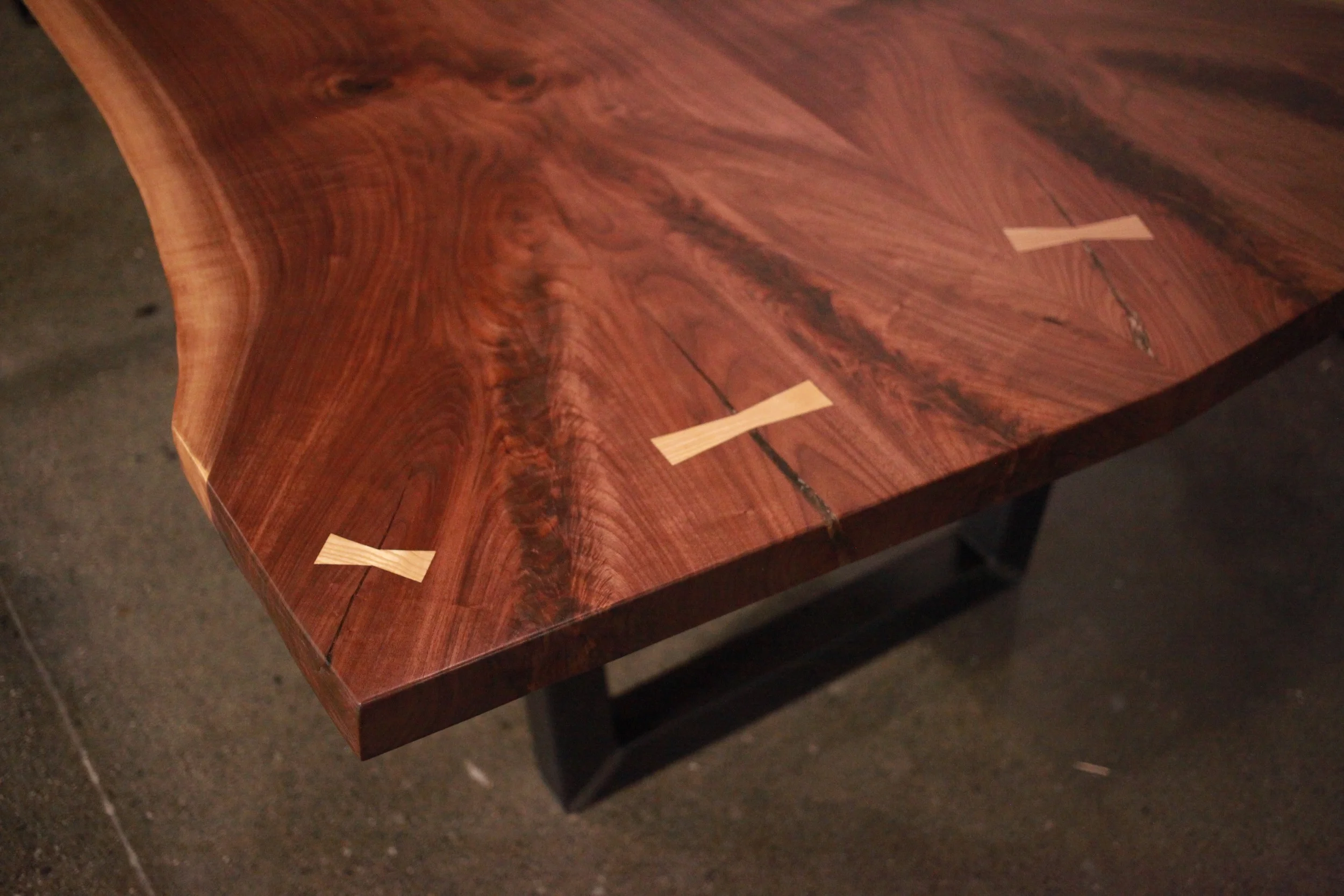 Both tables are made from Walnut Slabs with a steel base. One is 10' long by 56'' wide with a 30'' waterfall drop on one side that faces the window to the outside of the building. The other table is 10' long by 52'' wide. Both bookmatch tables with Ash bowties joints.